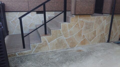 外壁の色に合わせグレー系のシックな乱張り石仕上げが完成です🎵